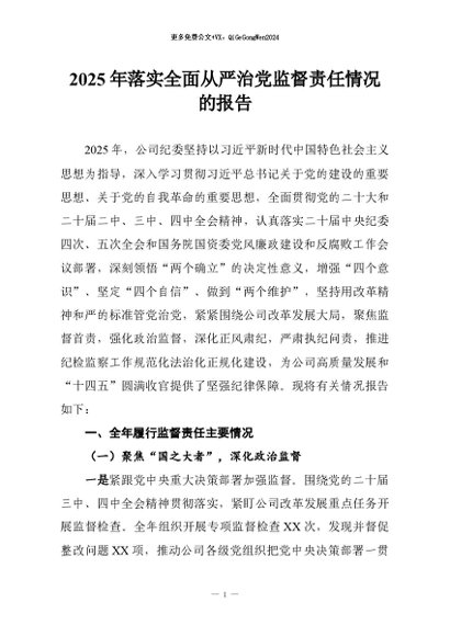 【七哥公文】2026年:2025年落实全面从严治党监督责任情况的报告+更多免费公文+VX:QiGeGongWen2024 - 七哥-AI智库