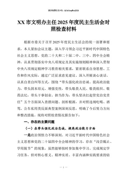 【七哥公文】2026年:XX市文明办主任2025年度民主生活会对照检查材料+更多免费公文+VX:QiGeGongWen2024 - 七哥-AI智库