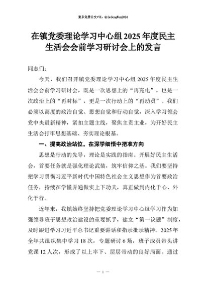【七哥公文】2026年:在镇党委理论学习中心组2025年度民主生活会会前学习研讨会上的发言+更多免费公文+VX:QiGeGongWen2024