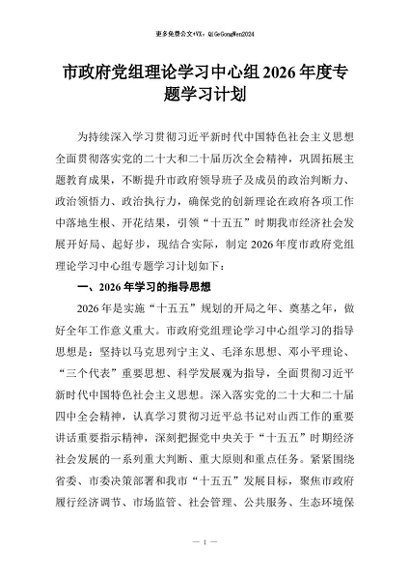 【七哥公文】2026年:市政府党组理论学习中心组2026年度专题学习计划+更多免费公文+VX:QiGeGongWen2024