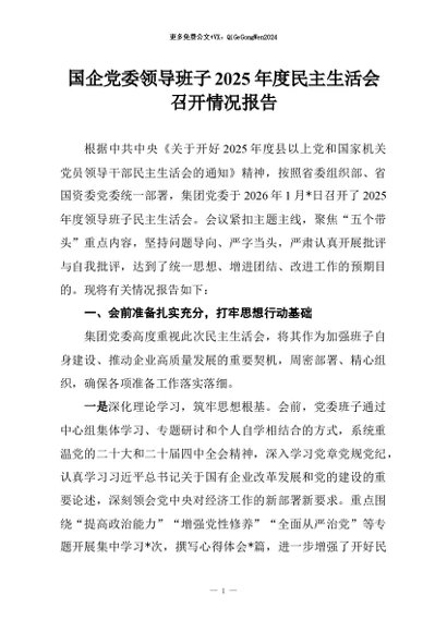 【七哥公文】2026年:国企党委领导班子2025年度民主生活会召开情况报告+更多免费公文+VX:QiGeGongWen2024