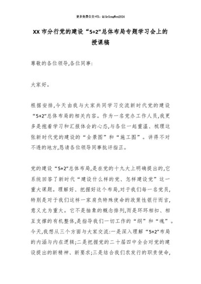 【七哥公文】2026年:XX市分行党的建设“5+2”总体布局专题学习会上的授课稿_副本+更多免费公文+VX:QiGeGongWen2024