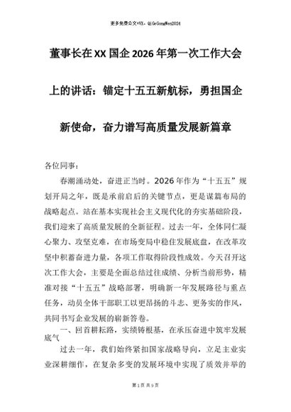 【七哥公文】2026年:董事长在XX国企2026年第一次工作大会上的讲话:锚定十五五新航标,勇担国企新使命,奋力谱写高质量发展新篇章+更多免费公文+VX:QiGeGongWen2024