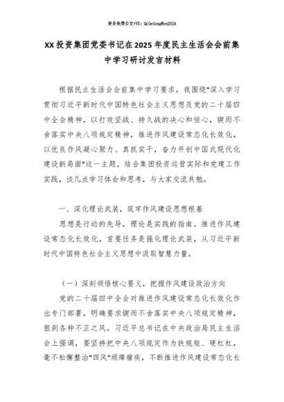 【七哥公文】2026年:XX投资集团党委书记在2025年度民主生活会会前集中学习研讨发言材料_副本+更多免费公文+VX:QiGeGongWen2024