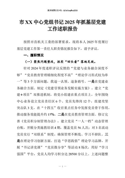 【七哥公文】2026年:市XX中心党组书记2025年抓基层党建工作述职报告+更多免费公文+VX:QiGeGongWen2024