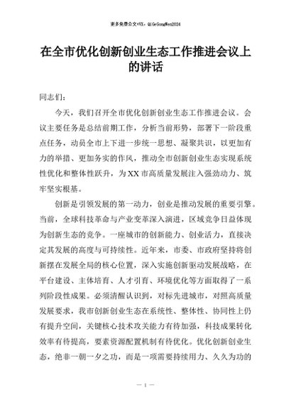/ 【七哥公文】2026年:在全市优化创新创业生态工作推进会议上的讲话+更多免费公文+VX:QiGeGongWen2024