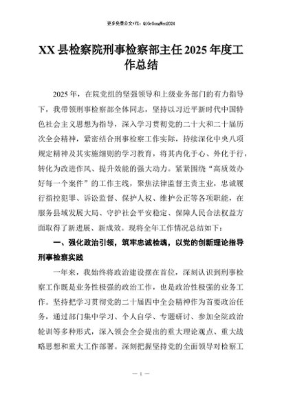 / 【七哥公文】2026年:XX县检察院刑事检察部主任2025年度工作总结+更多免费公文+VX:QiGeGongWen2024
