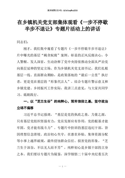 【七哥公文】2026年:在乡镇机关党支部集体观看《一步不停歇半步不退让》专题片活动上的讲话+更多免费公文+VX:QiGeGongWen2024