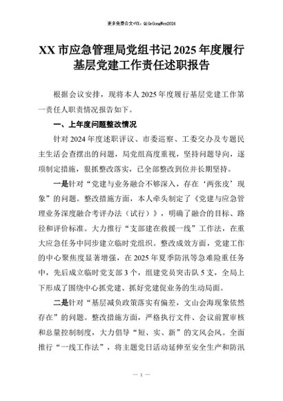 【七哥公文】2026年:XX市应急管理局党组书记2025年度履行基层党建工作责任述职报告+更多免费公文+VX:QiGeGongWen2024