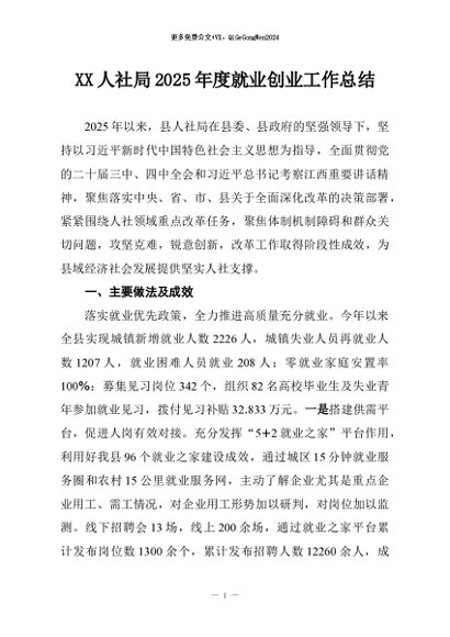 【七哥公文】2026年:XX人社局2025年度就业创业工作总结+更多免费公文+VX:QiGeGongWen2024