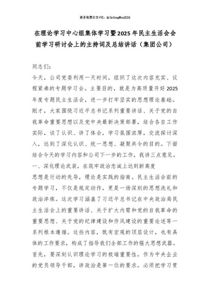 【七哥公文】2026年:在理论学习中心组集体学习暨2025年民主生活会会前学习研讨会上的主持词及总结讲话(集团公司)_副本+更多免费公文+VX:QiGeGongWen2024 - 七哥-AI智库