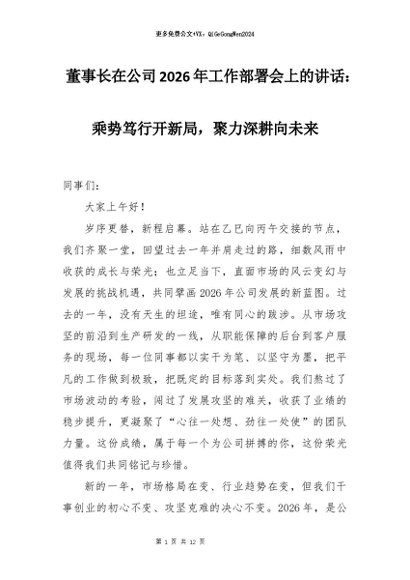 【七哥公文】2026年:董事长在公司2026年工作部署会上的讲话:乘势笃行开新局,聚力深耕向未来+更多免费公文+VX:QiGeGongWen2024