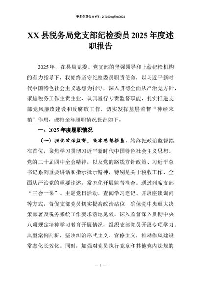 / 【七哥公文】2026年:XX县税务局党支部纪检委员2025年度述职报告+更多免费公文+VX:QiGeGongWen2024