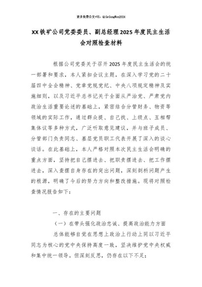 【七哥公文】2026年:XX铁矿公司党委委员、副总经理2025年度民主生活会对照检查材料_副本+更多免费公文+VX:QiGeGongWen2024