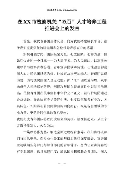 【七哥公文】2026年:在XX市检察机关“双百”人才培养工程推进会上的发言+更多免费公文+VX:QiGeGongWen2024