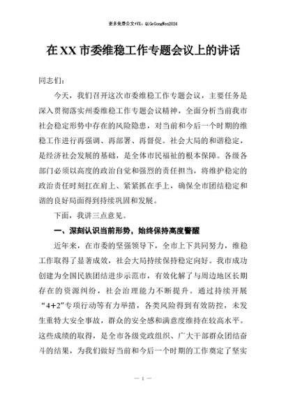 / 【七哥公文】2026年:在XX市委维稳工作专题会议上的讲话+更多免费公文+VX:QiGeGongWen2024