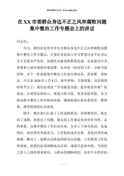 【七哥公文】2026年:在XX市委群众身边不正之风和腐败问题集中整治工作专题会上的讲话+更多免费公文+VX:QiGeGongWen2024