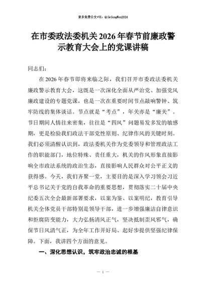 【七哥公文】2026年:在市委政法委机关2026年春节前廉政警示教育大会上的党课讲稿+更多免费公文+VX:QiGeGongWen2024