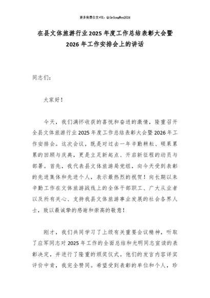 【七哥公文】2026年:在县文体旅游行业2025年度工作总结表彰大会暨2026年工作安排会上的讲话_副本+更多免费公文+VX:QiGeGongWen2024