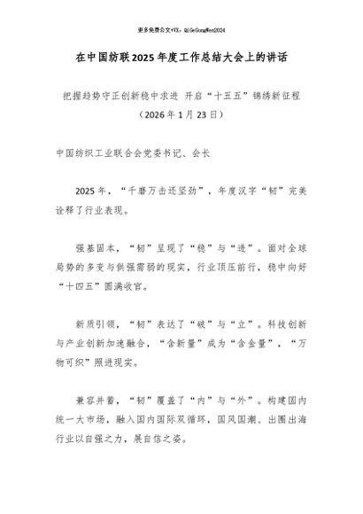 【七哥公文】2026年:在中国纺联2025年度工作总结大会上的讲话_副本+更多免费公文+VX:QiGeGongWen2024