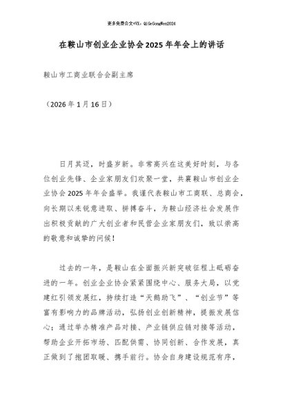 【七哥公文】2026年:在鞍山市创业企业协会2025年年会上的讲话_副本+更多免费公文+VX:QiGeGongWen2024