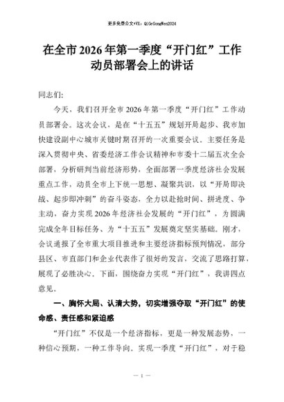 【七哥公文】2026年:在全市2026年第一季度“开门红”工作动员部署会上的讲话+更多免费公文+VX:QiGeGongWen2024