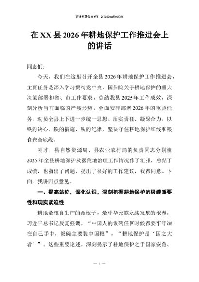 / 【七哥公文】2026年:在XX县2026年耕地保护工作推进会上的讲话+更多免费公文+VX:QiGeGongWen2024