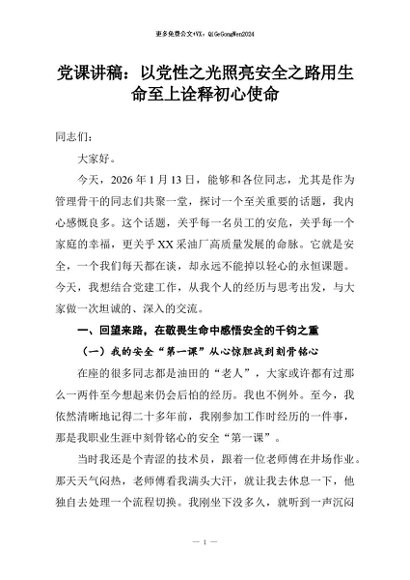 【七哥公文】2026年:党课讲稿:以党性之光照亮安全之路用生命至上诠释初心使命+更多免费公文+VX:QiGeGongWen2024