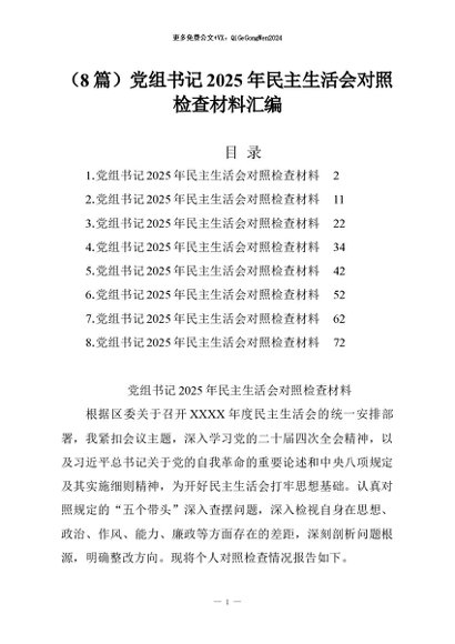【七哥公文】2026年:(8篇)党组书记2025年民主生活会对照检查材料汇编+更多免费公文+VX:QiGeGongWen2024