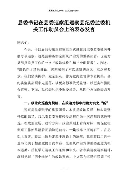【七哥公文】2026年:县委书记在县委巡察组巡察县纪委监委机关工作动员会上的表态发言+更多免费公文+VX:QiGeGongWen2024