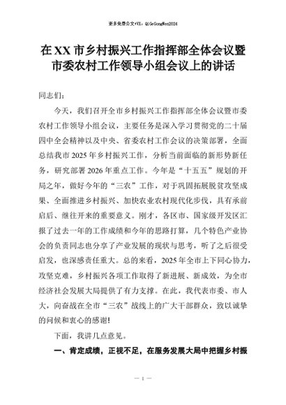 【七哥公文】2026年:在XX市乡村振兴工作指挥部全体会议暨市委农村工作领导小组会议上的讲话+更多免费公文+VX:QiGeGongWen2024
