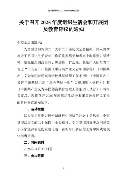 【七哥公文】2026年:关于召开2025年度组织生活会和开展团员教育评议的通知+更多免费公文+VX:QiGeGongWen2024