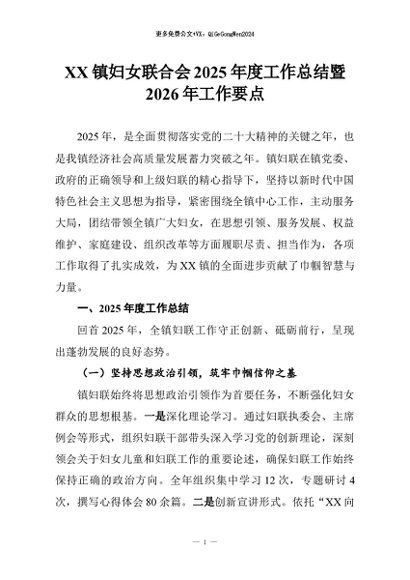 【七哥公文】2026年:XX镇妇女联合会2025年度工作总结暨2026年工作要点+更多免费公文+VX:QiGeGongWen2024