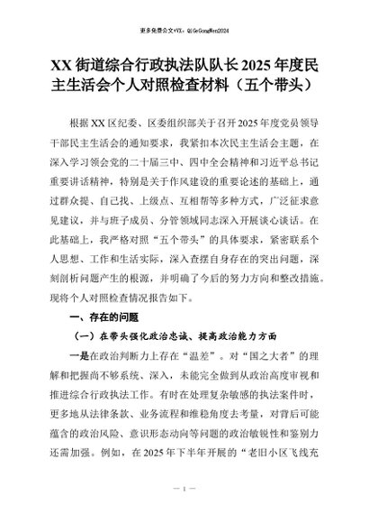 【七哥公文】2026年:XX街道综合行政执法队队长2025年度民主生活会个人对照检查材料(五个带头)+更多免费公文+VX:QiGeGongWen2024