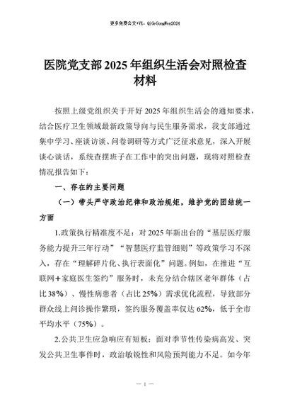 【七哥公文】2026年:医院党支部2025年组织生活会对照检查材料+更多免费公文+VX:QiGeGongWen2024