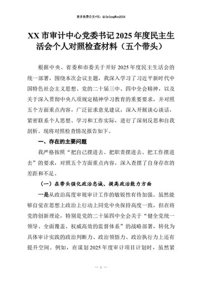 【七哥公文】2026年:XX市审计中心党委书记2025年度民主生活会个人对照检查材料(五个带头)+更多免费公文+VX:QiGeGongWen2024