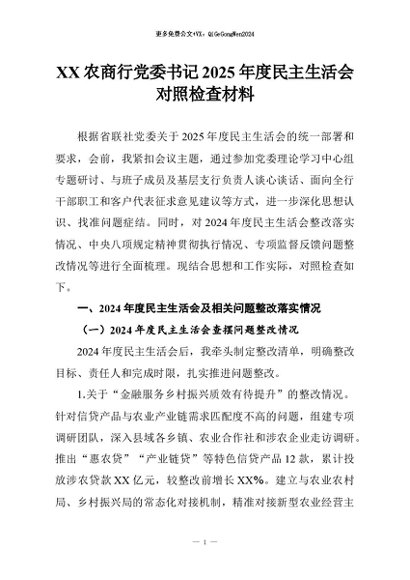 【七哥公文】2026年:XX农商行党委书记2025年度民主生活会对照检查材料+更多免费公文+VX:QiGeGongWen2024