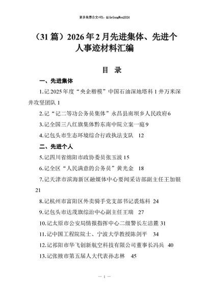【七哥公文】2026年:(31篇)2026年2月先进集体、先进个人事迹材料汇编+更多免费公文+VX:QiGeGongWen2024