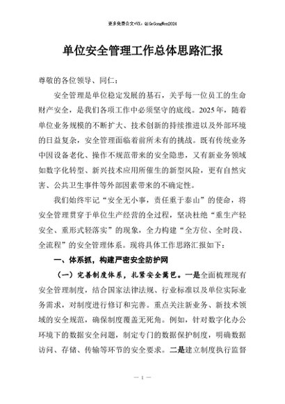 / 【七哥公文】2026年:单位安全管理工作总体思路汇报+更多免费公文+VX:QiGeGongWen2024