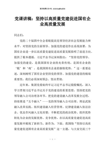 【七哥公文】2026年:党课讲稿:坚持以高质量党建促进国有企业高质量发展+更多免费公文+VX:QiGeGongWen2024