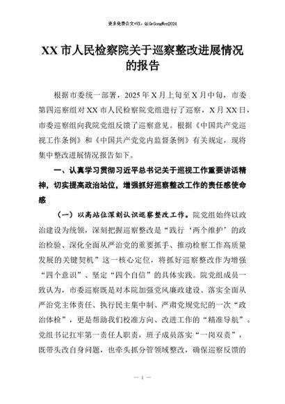 / 【七哥公文】2026年:XX市人民检察院关于巡察整改进展情况的报告+更多免费公文+VX:QiGeGongWen2024