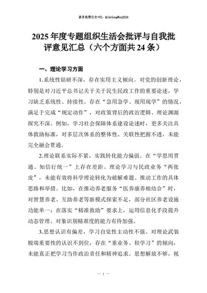 【七哥公文】2026年:2025年度专题组织生活会批评与自我批评意见汇总(六个方面共24条)+更多免费公文+VX:QiGeGongWen2024