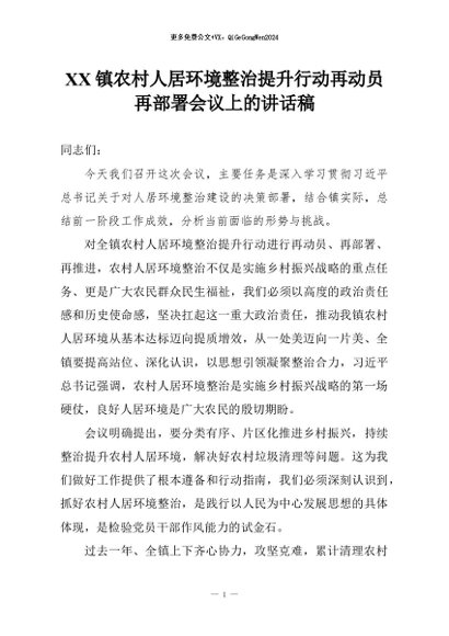 【七哥公文】2026年:XX镇农村人居环境整治提升行动再动员再部署会议上的讲话稿+更多免费公文+VX:QiGeGongWen2024