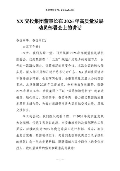 【七哥公文】2026年:XX交投集团董事长在2026年高质量发展动员部署会上的讲话+更多免费公文+VX:QiGeGongWen2024