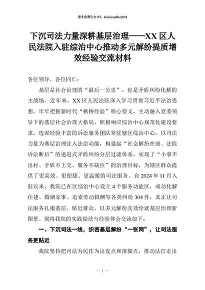 【七哥公文】2026年:下沉司法力量深耕基层治理——XX区人民法院入驻综治中心推动多元解纷提质增效经验交流材料+更多免费公文+VX:QiGeGongWen2024