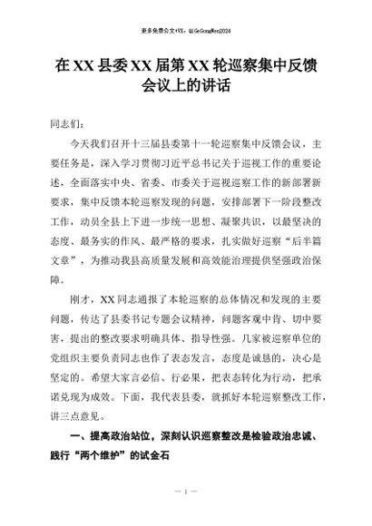 【七哥公文】2026年:在XX县委XX届第XX轮巡察集中反馈会议上的讲话+更多免费公文+VX:QiGeGongWen2024