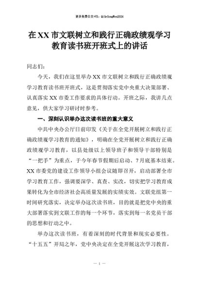 【七哥公文】2026年:在XX市文联树立和践行正确政绩观学习教育读书班开班式上的讲话+更多免费公文+VX:QiGeGongWen2024