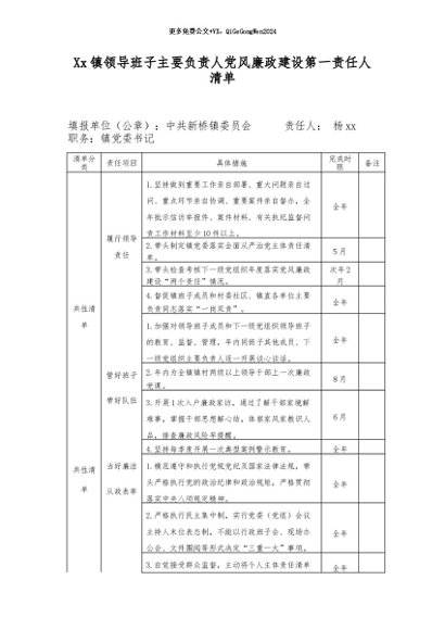 【七哥公文】2026年:Xx镇领导班子主要负责人党风廉政建设第一责任人清单+更多免费公文+VX:QiGeGongWen2024