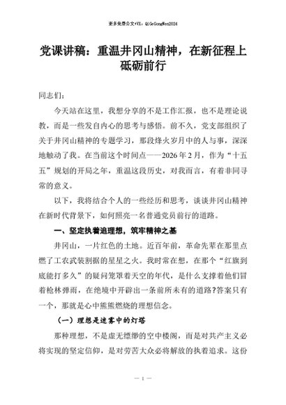 【七哥公文】2026年:党课讲稿:重温井冈山精神,在新征程上砥砺前行+更多免费公文+VX:QiGeGongWen2024 - 七哥-AI智库