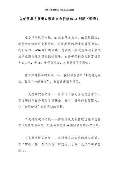 【七哥公文】2026年:以优质服务展窗口形象全力护航xx5A创建(酒店)_副本+更多免费公文+VX:QiGeGongWen2024